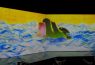 クレヨンで塗り絵した建物や飛行機の絵をスキャナーで読み込ませると、画面に登場するアート。